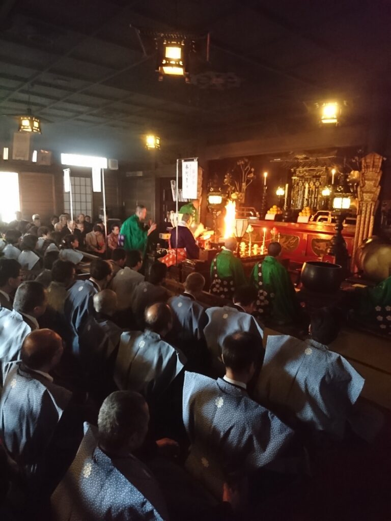 11時50分より裃姿に身を包んだ年男・年女の皆様のお練り行列、正午より護摩堂にて特別大護摩供を厳修し、護摩供終了後に豆まき式となります。