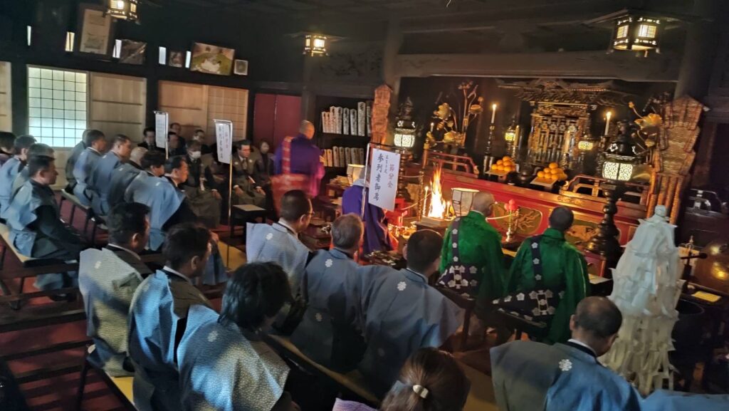そして午前11時50分より裃に身を包んだ年男・年女の方々が山伏の先導で参道から護摩堂まで練り歩き、正午より護摩堂にて開運厄除護摩祈祷を厳修いたしました。