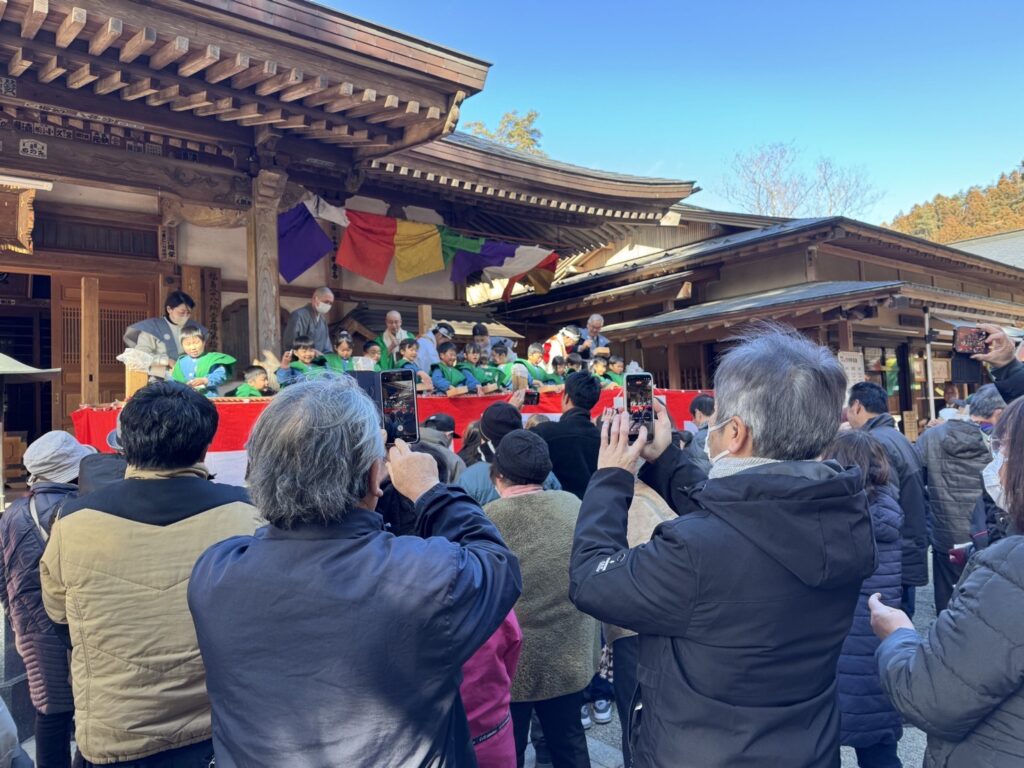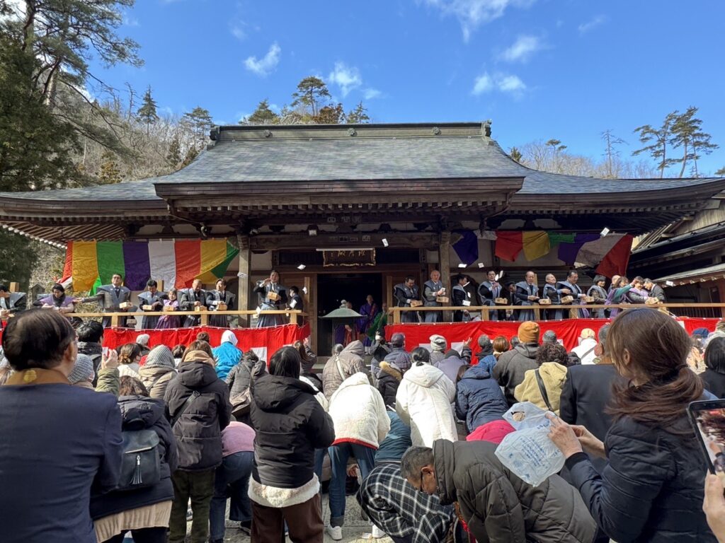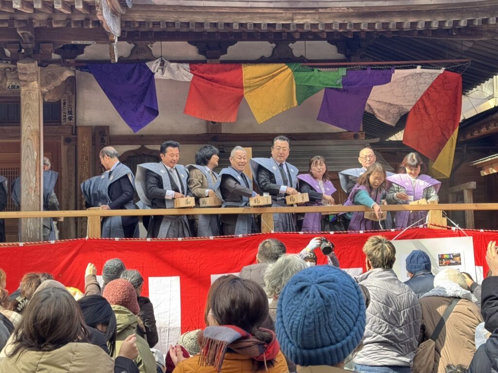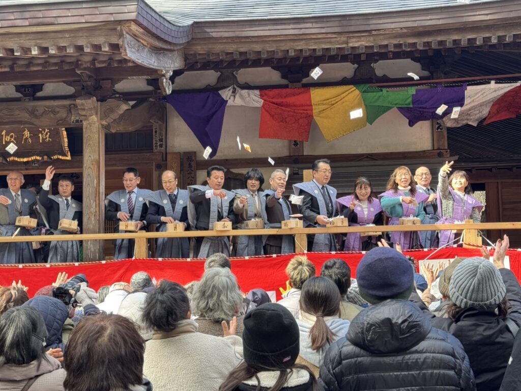 その後、特設舞台にて年男・年女の方、招待者の皆さま、総代代表の方々による、豆まき式が行われ、平日にも関わらず、寒い中当山までお越しいただいた非常に多くの参拝者の方々の頭上に福豆が撒かれました。