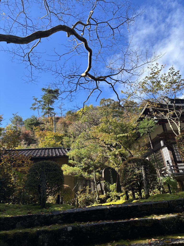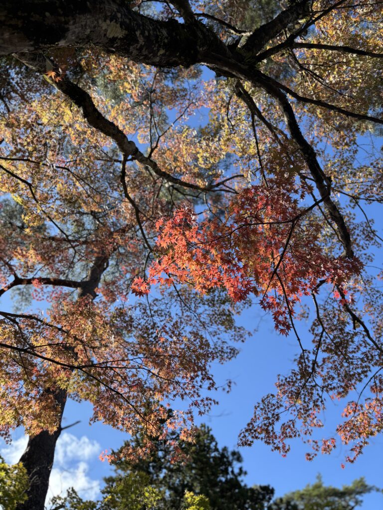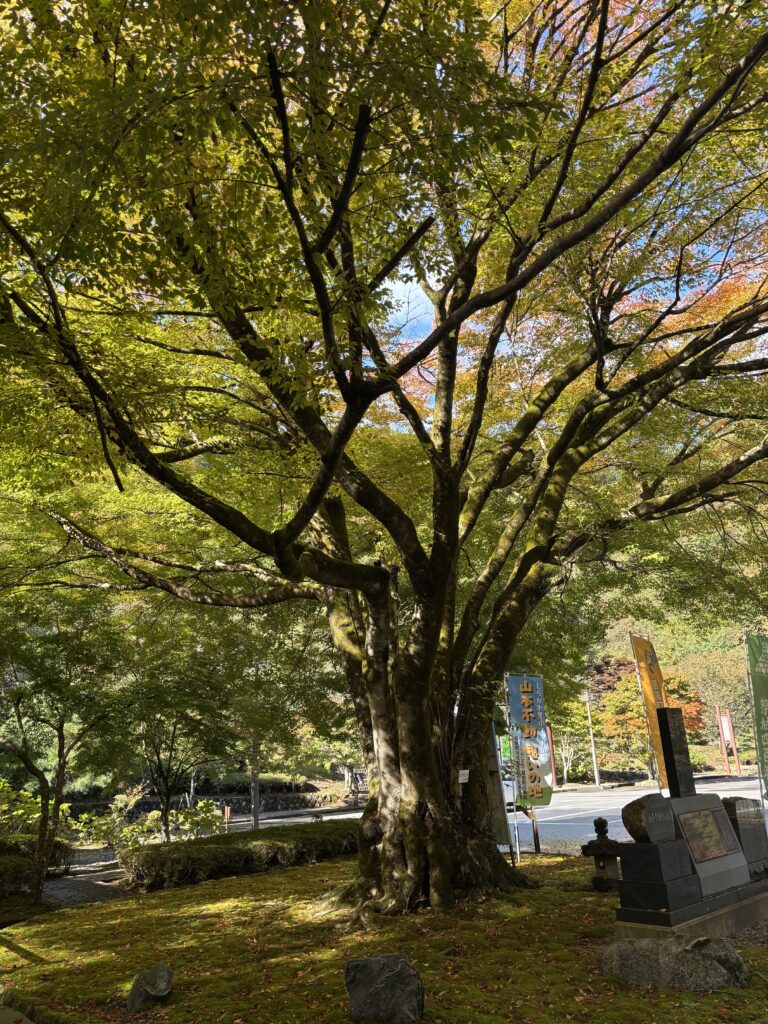 駐車場のカエデや山々はほんのり赤く黄色く色づいてきています。